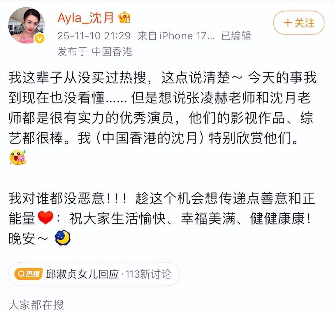 不少内地沈月粉丝表达不满,直言香港沈月不知道是从哪里冒出来的,要不换个名字,不要碰瓷前辈等等。看到所有人都在抵制自己,香港沈月发了一个大大的问号,不过很快便删除了,随后又发了一条比较体面的话:“我这辈子没买过热搜,这点说清楚,今天的事情我现在也没懂,但是想说张凌赫老师和沈月老师都是很有实力的优秀演员,他们的影视作品,综艺都很棒,我(中国香港的沈月)特别欣赏他们,我对谁都没有恶意,趁这个机会想传递点善意和正能量,祝大家生活愉快,幸福美满,健健康康,晚安~”。